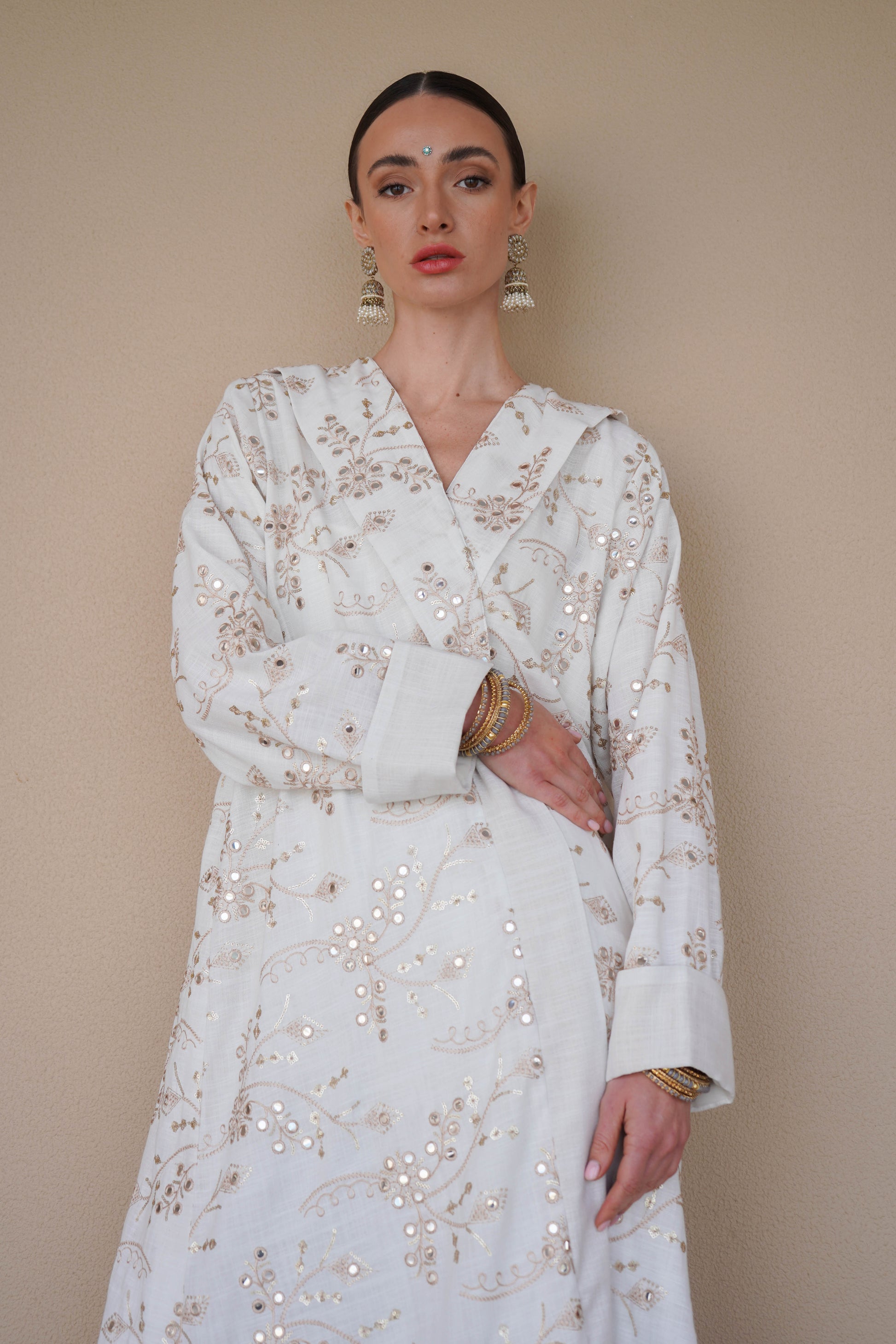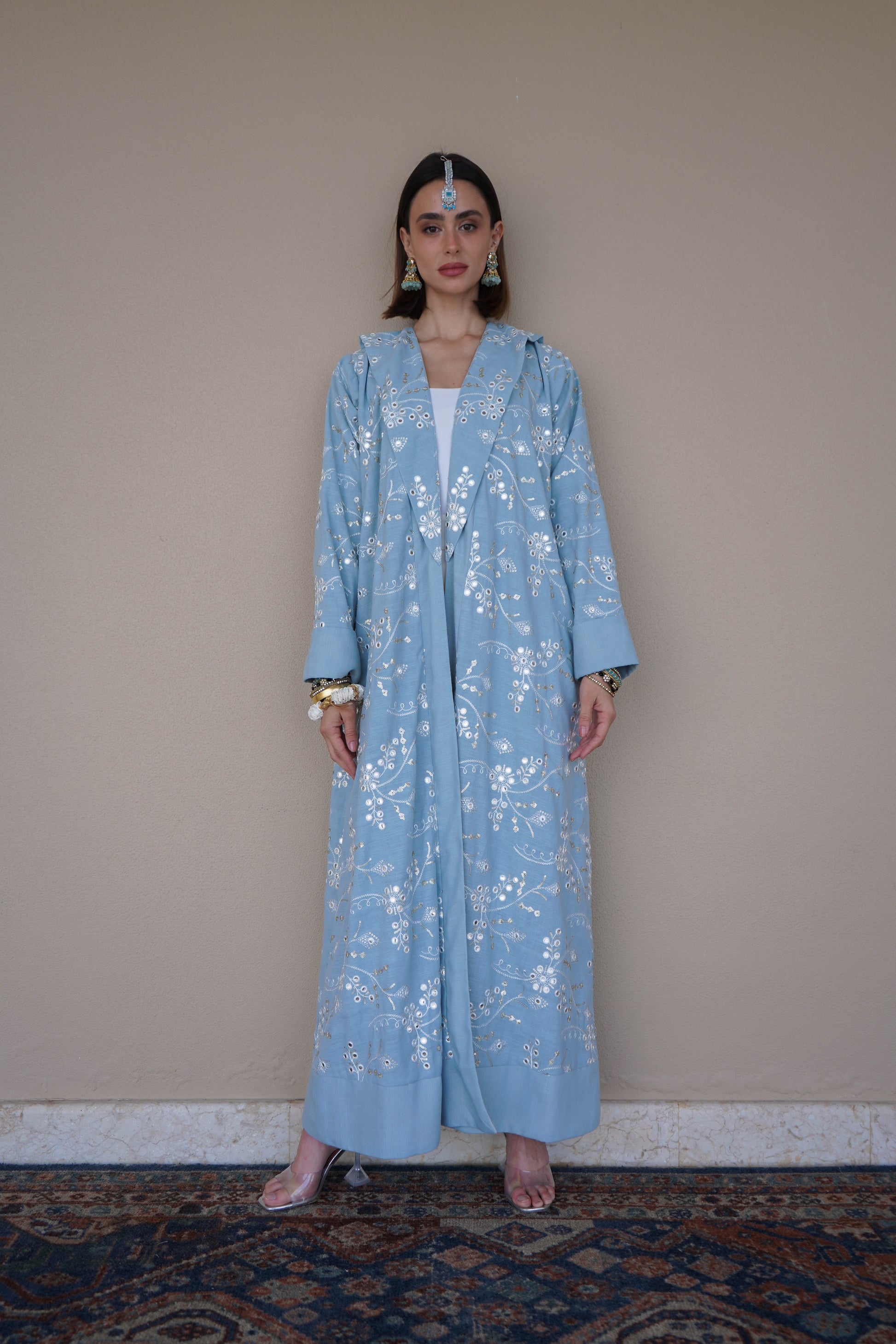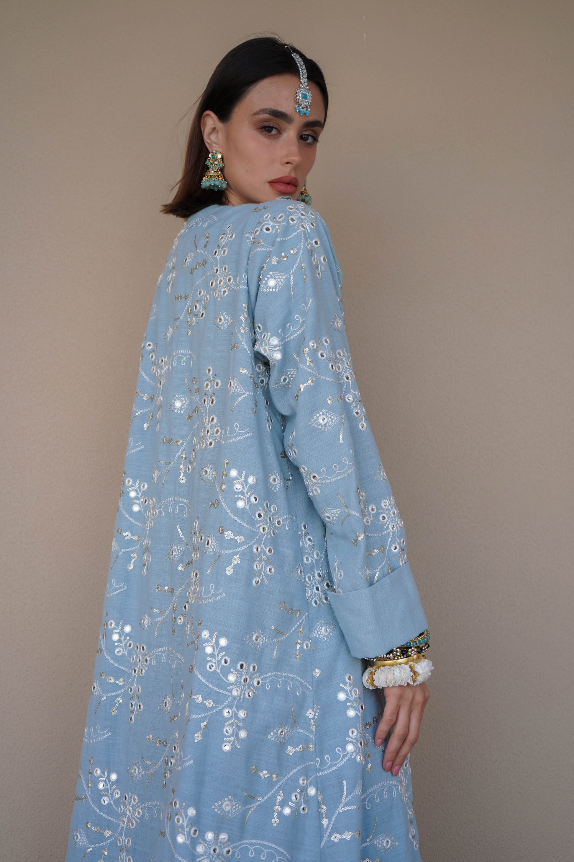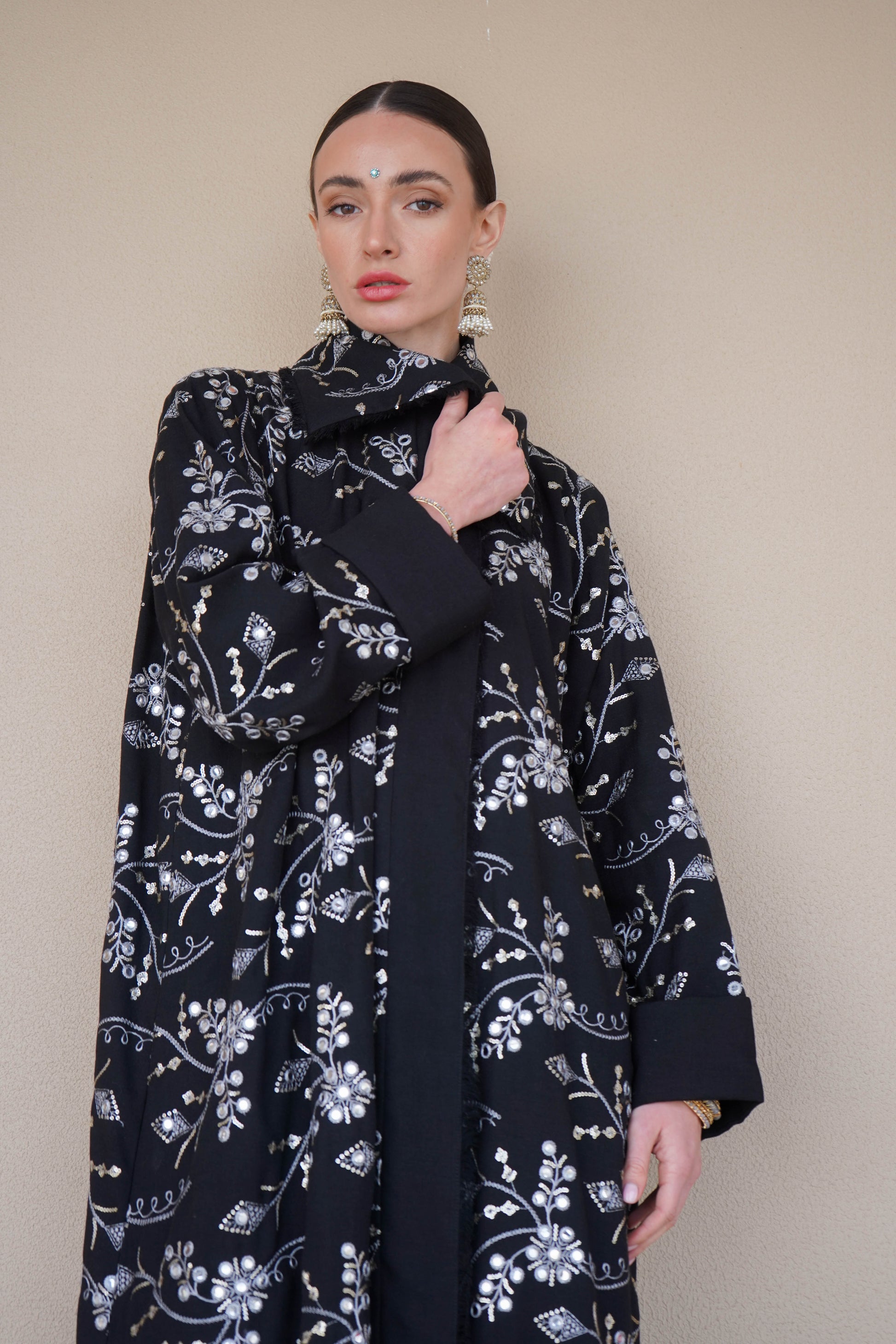 Named after history's most coveted diamond, Kohinoor celebrates South Asian grandeur with intricate embroidery and mirror-work that catches light like precious gems. This abaya doesn't just dress you—it crowns you. Wear it with the confidence of someone who knows they're the most dazzling person in the room.