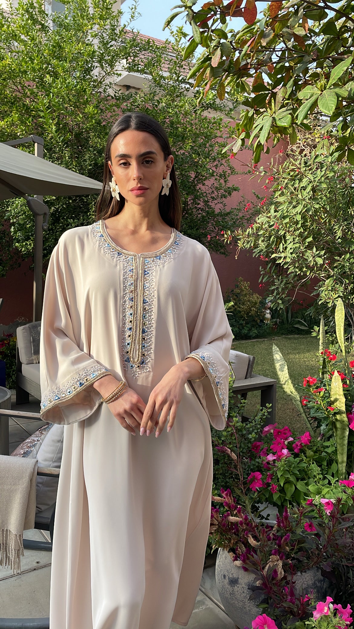 Inspired by the timeless beauty of the iconic Taj Mahal, this exceptional mkhawar features intricate design elements that pay homage to India's rich textile traditions. The embroidery placement draws from the sophisticated artistry of traditional Emirati mkhawars, creating a unique fusion that celebrates the best of both cultures.